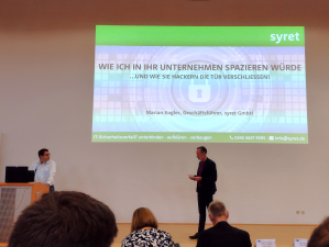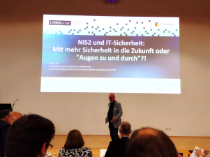 Anschließend gab Marian Kogler von der syret GmbH in seiner Demonstration "Praxistipp: Wie ich in Ihr Unternehmen spazieren würde - …und wie Sie Hackern die Tür verschließen!" Einblick in das Vorgehen von Hacker, die ein Unternehmen ausspähen oder angreifen wollen. Mit dem Vortrag "NIS2 und IT-Sicherheit: Wird die Kür für mich zur Pflicht?" gab Volker Fett aus der Transferstelle Cybersicherheit im Mittelstand einen Überblick über die NIS-2 Richtlinie und sich daraus ergebende wesentliche Pflichten für Unternehmen. Die Vortragsreihe wurde abgeschlossen durch das Schlusswort von Jochen Hollmann vom Verfassungsschutz Sachsen-Anhalt, in dem er ein kurzes Resümee der Veranstaltung gab.