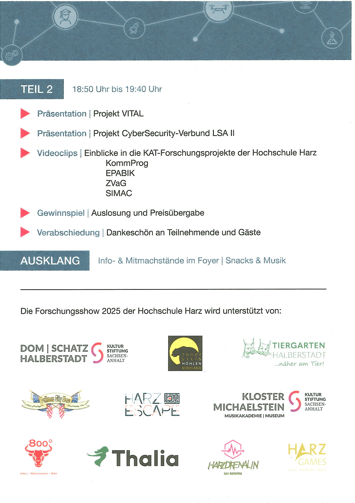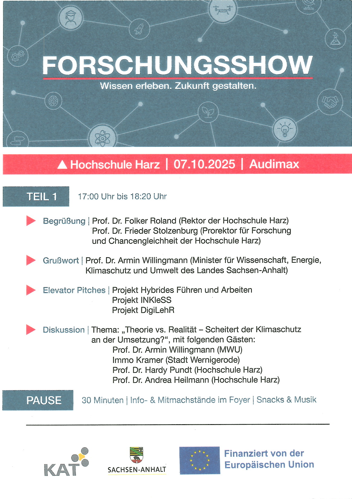 Vielen Dank an die Organisatoren, das Harzer Team des Kompetenznetzwerks für Angewandte und Transferorientierte Forschung (KAT), alle Vortragenden und weiteren Beteiligten, sowie an die Sponsoren. Die Forschungsshow war ein rundum gelungener Abend mit vielen spannenden Einblicken in die Forschungswelt an der Hochschule Harz.