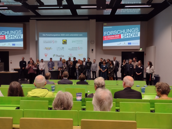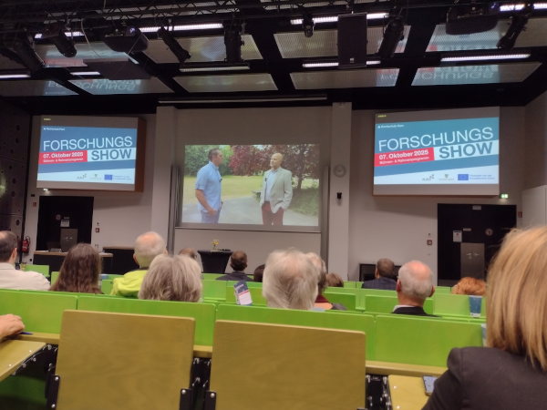 Forschung unterhaltsam erlebbar machen, das hatte sich die Forschungsshow am 7. Obktober 2025 an der Hochschule Harz in Wernigerode auf die Fahnen geschrieben. Es sollte verständlich aus aktuellen Projekten berichtet und die Zuhörenden in die Welt der Wissenschaft mitgenommen werden. Dazu wurden verschiedene Formate der Vermittlung genutzt. Neben Ständen und Mitmachangeboten im Foyer vor dem Hörsaal, gab es im selbigen eine "Forschungsshow". Die Veranstaltung wurde organisiert vom Harzer Team des Kompetenznetzwerks für Angewandte und Transferorientierte Forschung (KAT), das vom Land Sachsen-Anhalt und der Europäische Union finanziert wird. Die Moderation erfolgte durch Marija C. Bakker, die u. a. im WDR5 Radio das Wissenschaftsmagazin Quarks und die Literatursendung Westart Lesen moderiert.