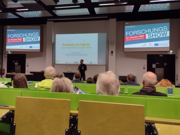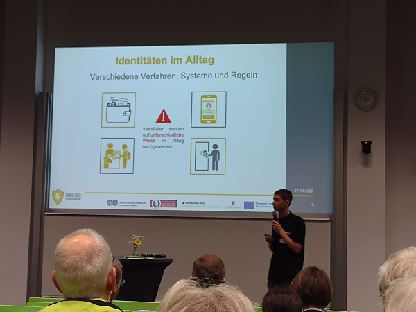 Gefolgt vom Vortrag unseres Projektes CyberSecurity Verbund LSA II - Hochschule Harz : "Ausweis im Handy - Digitale Identitäten einfach erklärt", vorgetragen durch Viktor Görbert. Er stellte in seinem Vortrag die Rolle der EUDI-Wallet für die Speicherung Digitaler Identitäten, insebsondere von Ausweisdaten vor. Weitere Anwendungsmöglichkeiten bis hin zu den durch unseren Demonstartor gegebenen Möglichkeiten für die Ausstellung von elektronischen Nachweisen wurden ebenfalls vorgestellt.